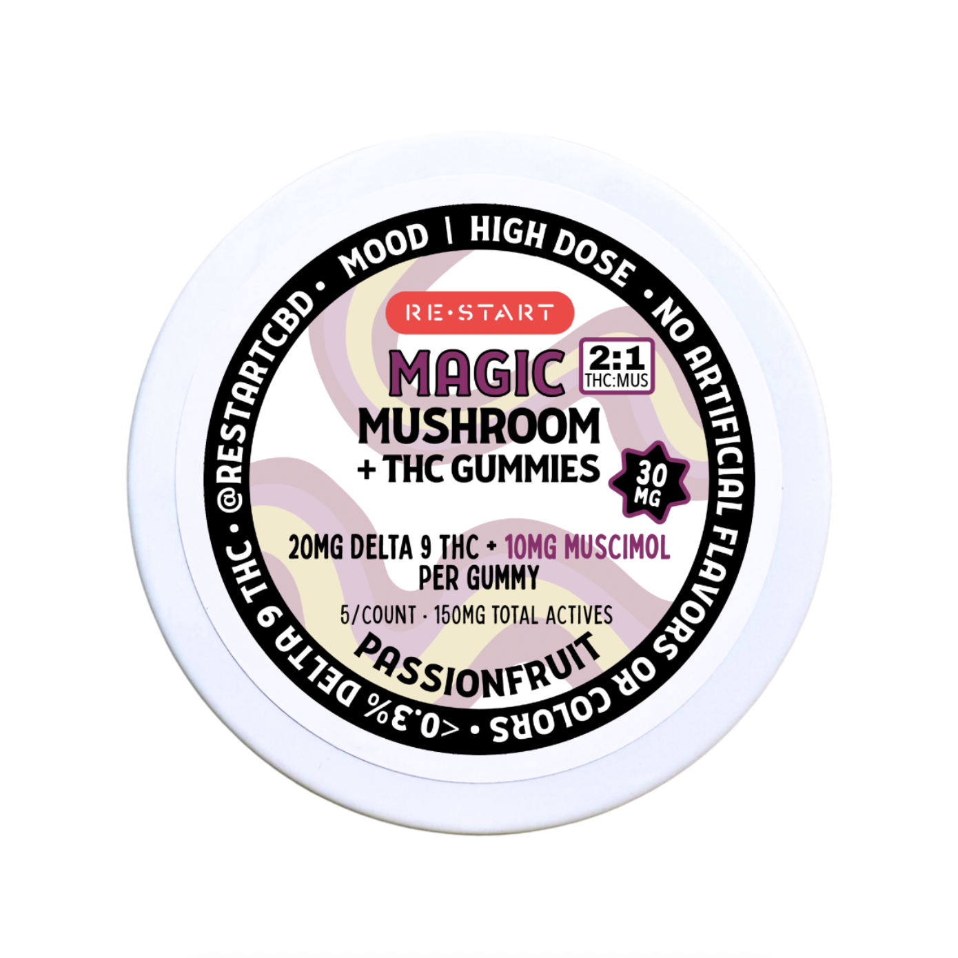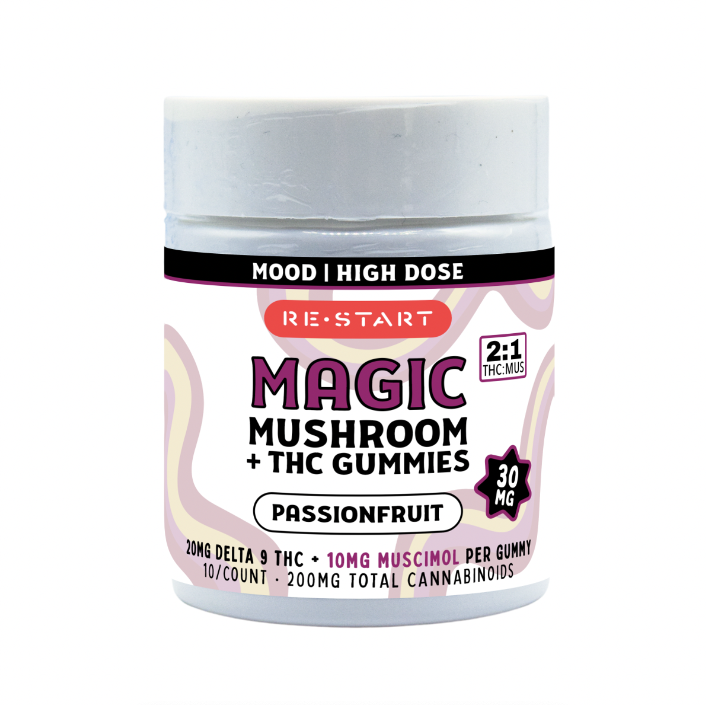| Flavor: Passion Fruit | Strength: 20mg Delta 9 THC + 10mg Muscimol | Servings per Container: 5 or 10 |